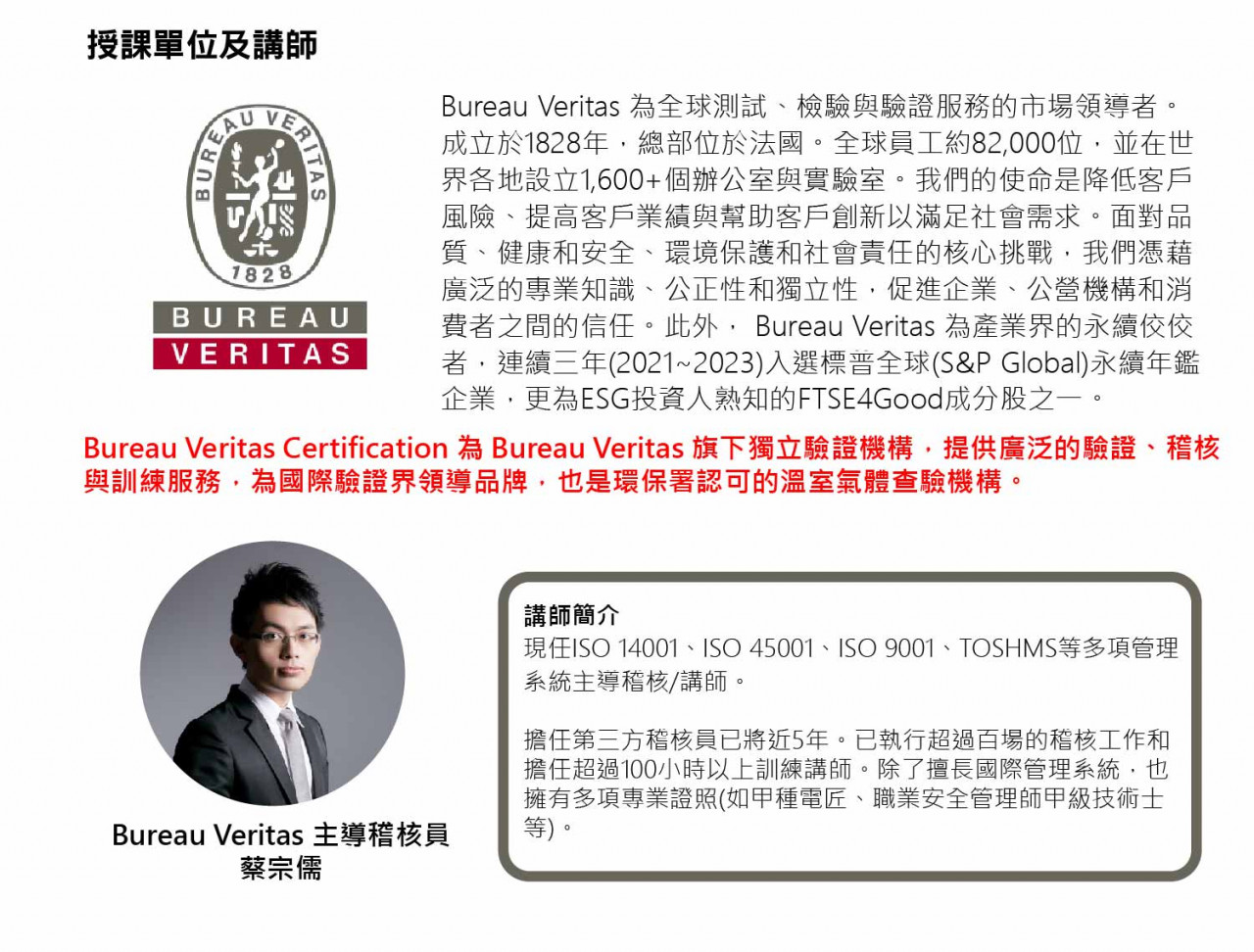 現任ISO 14001、ISO 45001、ISO 9001、TOSHMS等多項管理系統主導稽核/講師。 擔任第三方稽核員已將近5年。已執行超過百場的稽核工作和 擔任超過100小時以上訓練講師。除了擅長國際管理系統,也 擁有多項專業證照(如甲種電匠、職業安全管理師甲級技術士 等)。